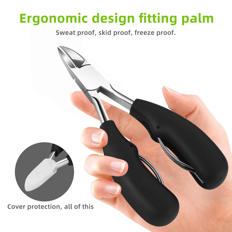 [UPGRADED CLIPPER] Nail clippers with non-slip ergonomic handle and large opening, takes less hand force to cut all size nails, including ingrown toenail, thick toenail, hard nail, grey nail, grooved nail etc. The sharp curved blade edge like eagle mouth fits the nail arc closely, is good at deeping into the nail groove to trim ingrown toenails.