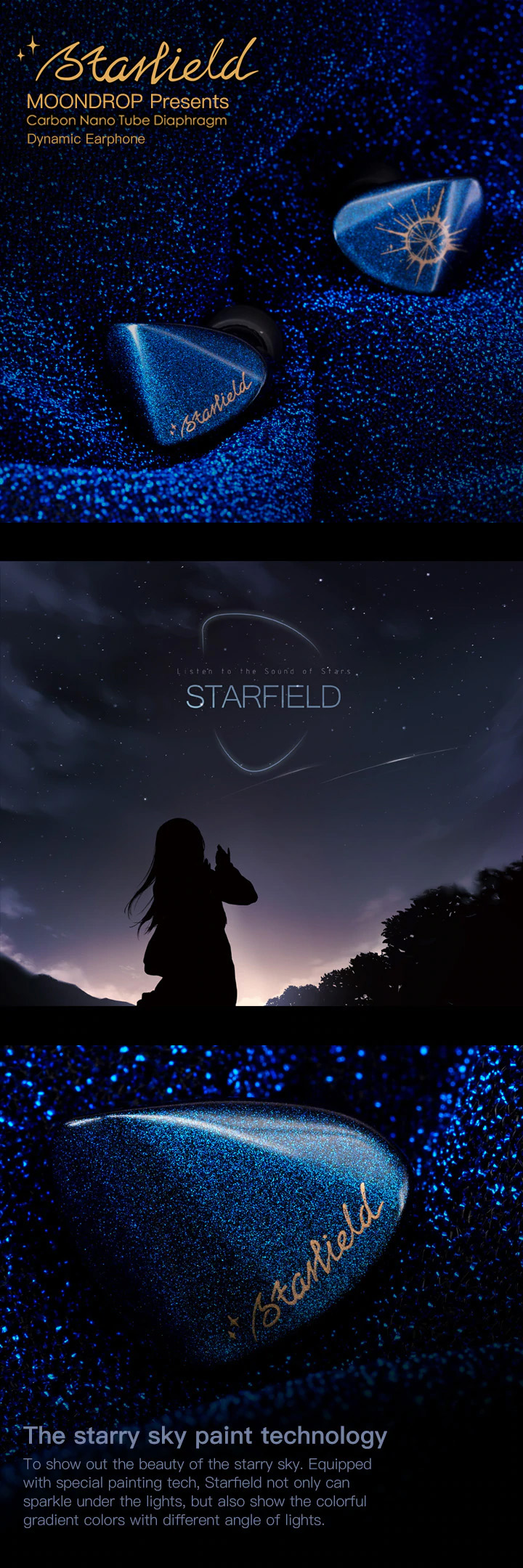 The Starfield's diaphragm is a composite of carbon nanotube array warp and weft knitted in a polymer film, making this only 6 microns (0.006 mm) thick diaphragm have a combination of high rigidity, high toughness and lightness, and provide clear, detailed and smooth treble.