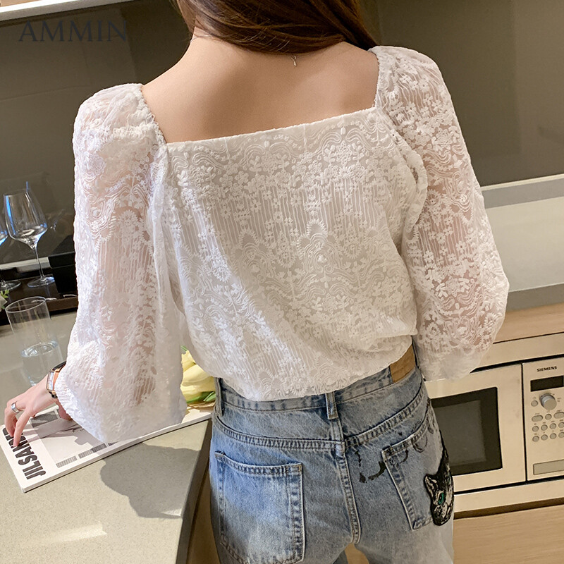 AMMIN new Korean wild crocheted long-sleeved lace shirt For Women Fashion Square Neck Slim Top Lady Embroidered Blouse