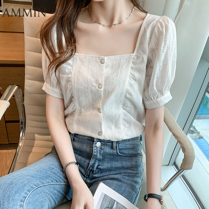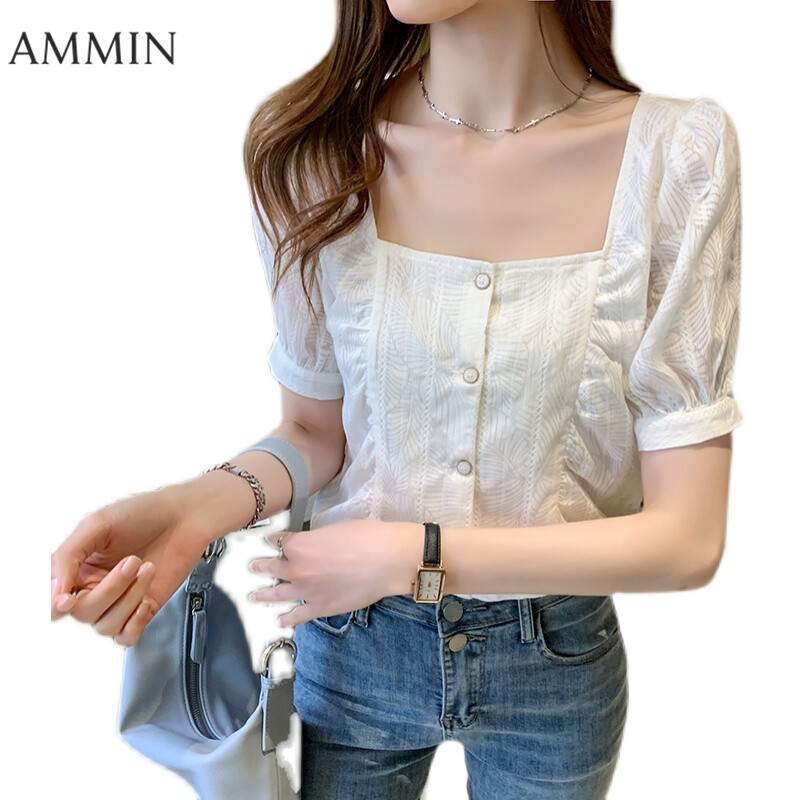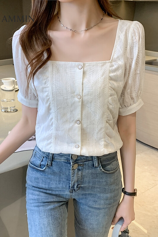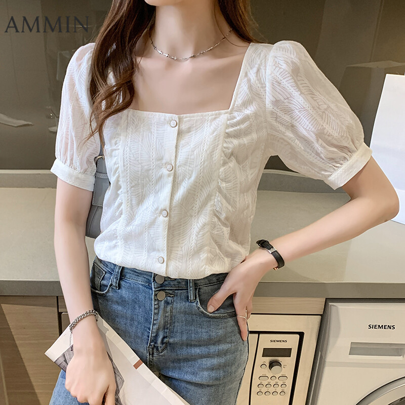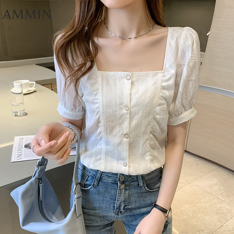 AMMIN Summer New French Style White Lace Square Collar Top For women Fashion Short Sleeve Bubble Shirt Chiffon Shirt Sweet Casual Lace Blouse