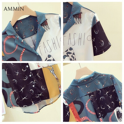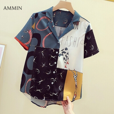 AMMIN Tops 2021 summer new item fashion retro Hong Kong flavor v-neck printed button cardigan chiffon shirt women's short-sleeved single-breasted design blouse