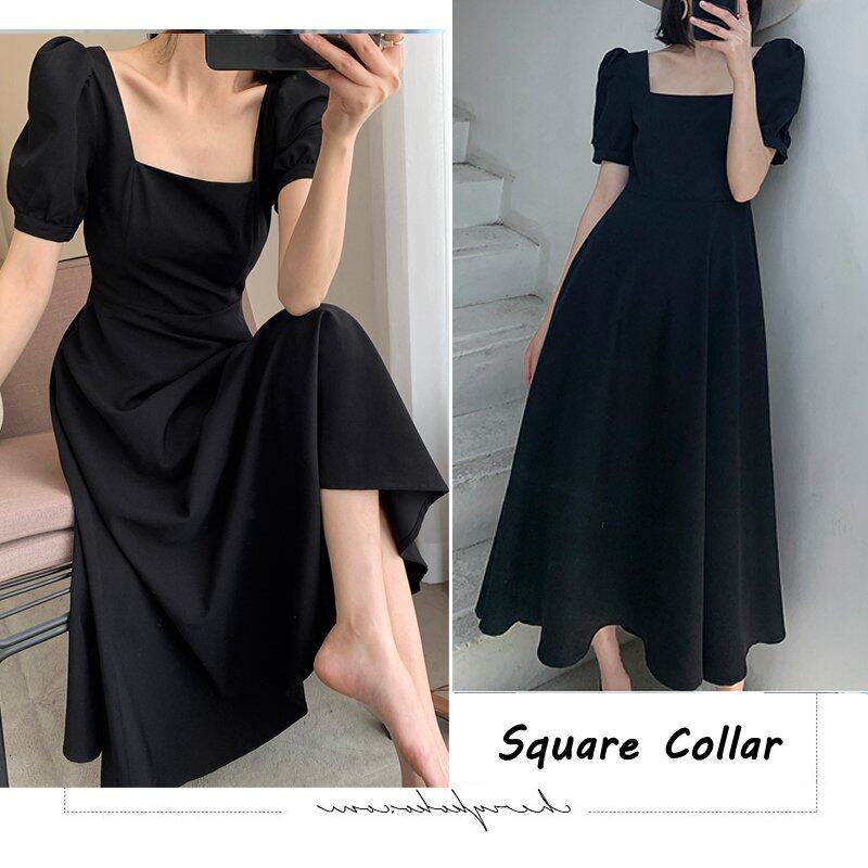 INWPLLR Women's Dress Fashion Plain Dress Elegant Casual Square Collar Short Sleeve Dresses Female Summer Style Long Dress