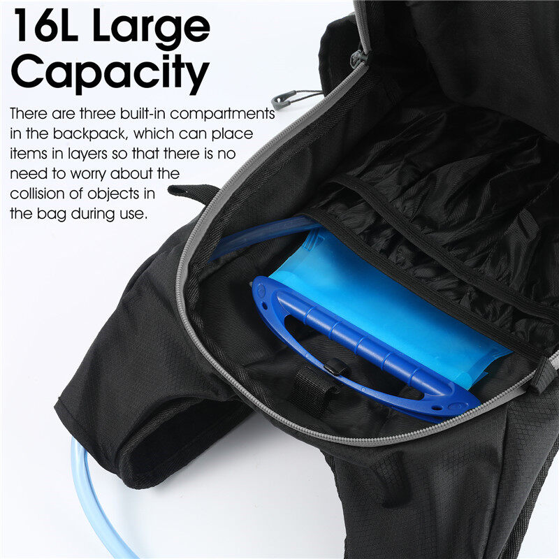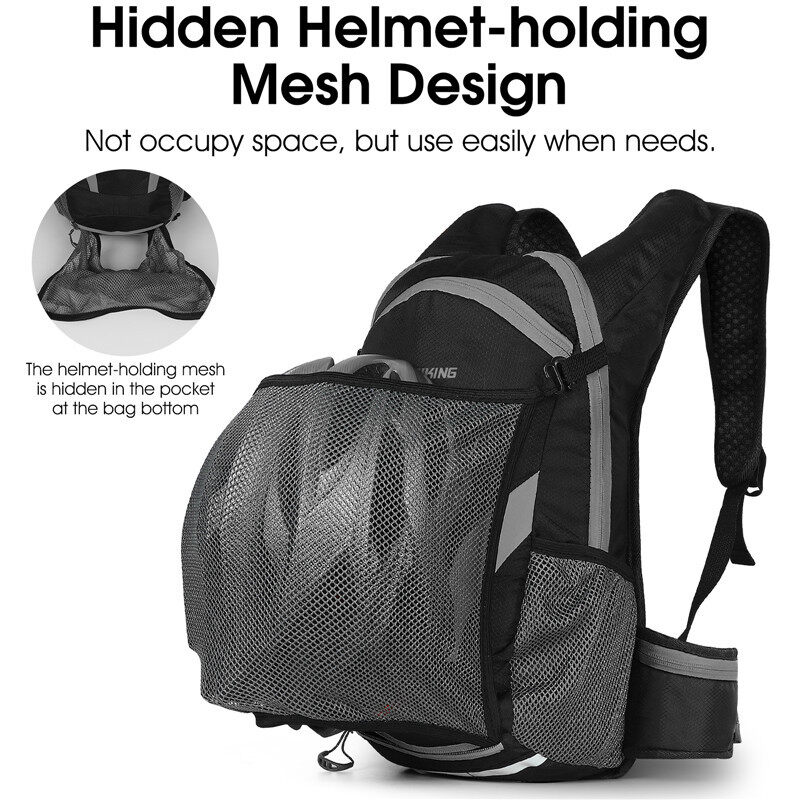 16L Large CapacityThere are three built-in compartments in the backpack,which can place items in layers so that there is no need to worry about the collision of objects in the bag during use.Hidden Helmet-holdingMesh DesignNot occupy space, but use easily when needs.Back meshHigh elastic and breathable mesh fabric is refreshin and not stuffy