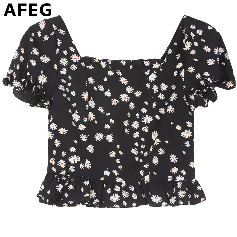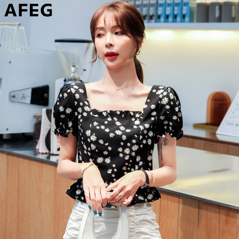 AFEG new Korean style square neck fashion high waist all-match small daisy chiffon puff sleeve blouse for women