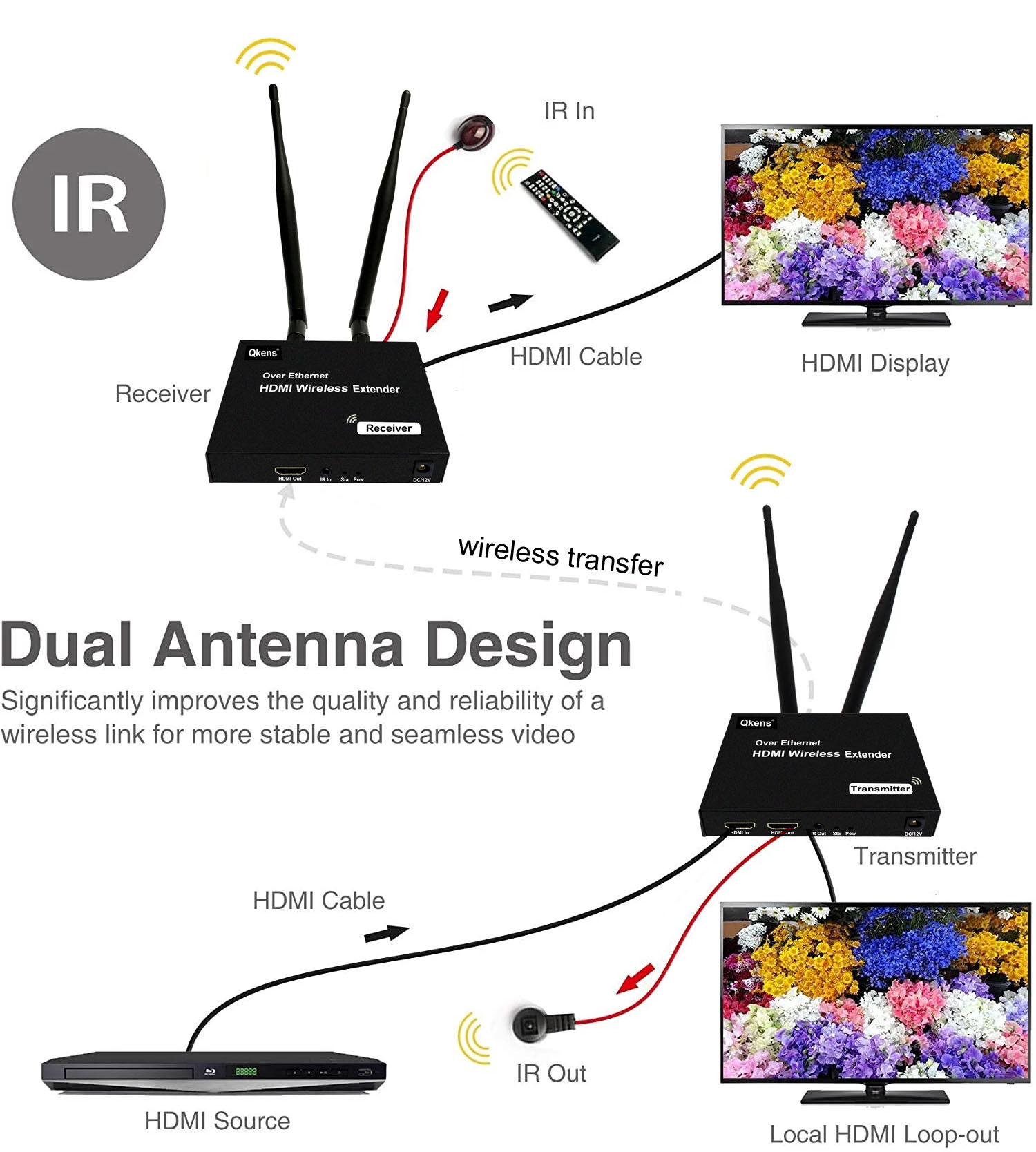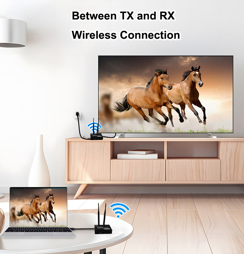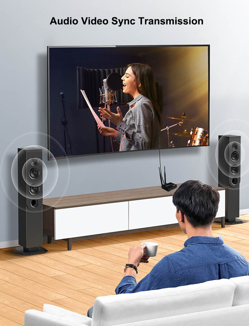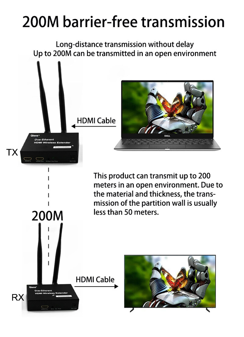 1. The product consists of a transmitter and a receiver, which transmits HDMI signals through wireless WIFI, and supports up to 1 transmitter to 4 receivers, 200 meters no obstruction; 164 ft (50 meters) through the wall.