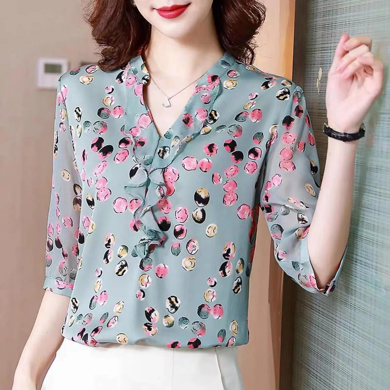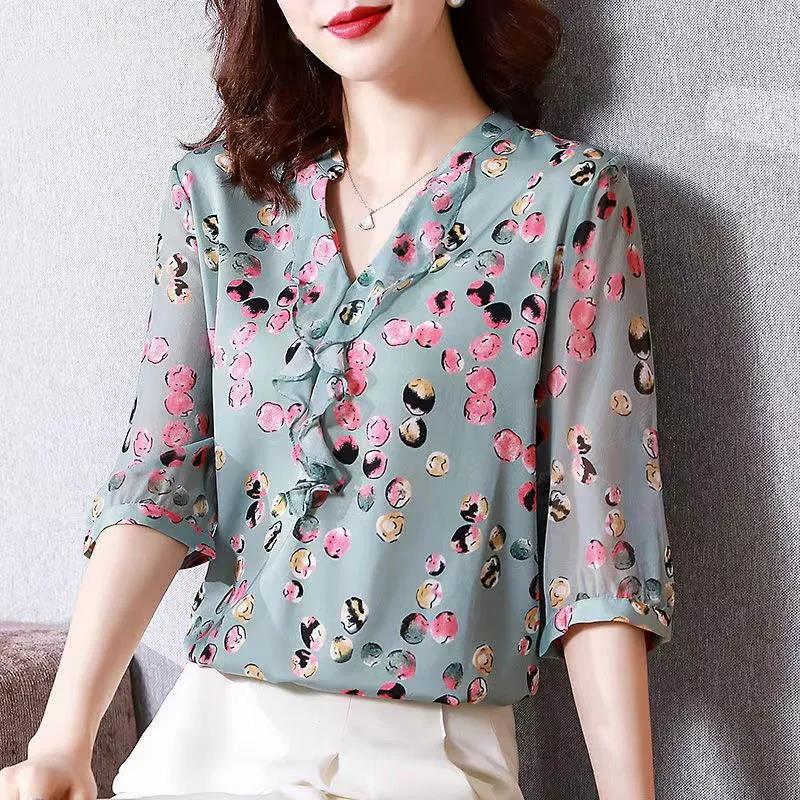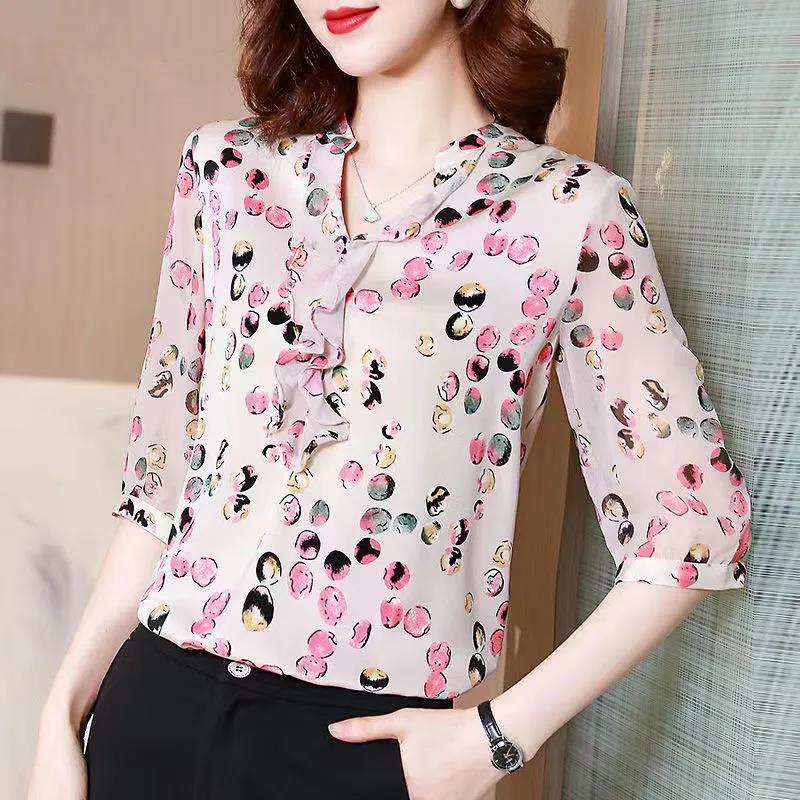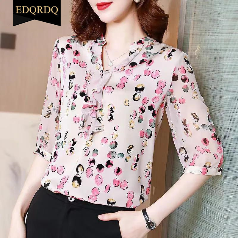 EDQRDQ Women's Stretchy Ruffle V Neck 3/4 Sleeve Slim Solid Elegant Chiffon Blouse Top