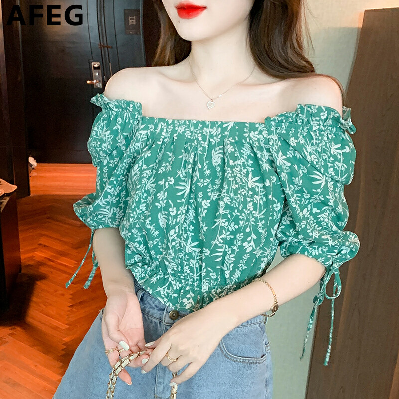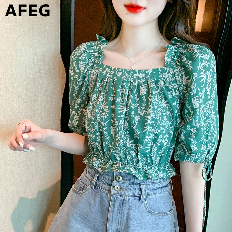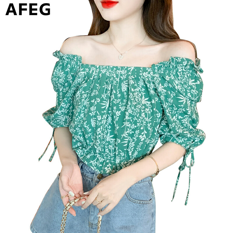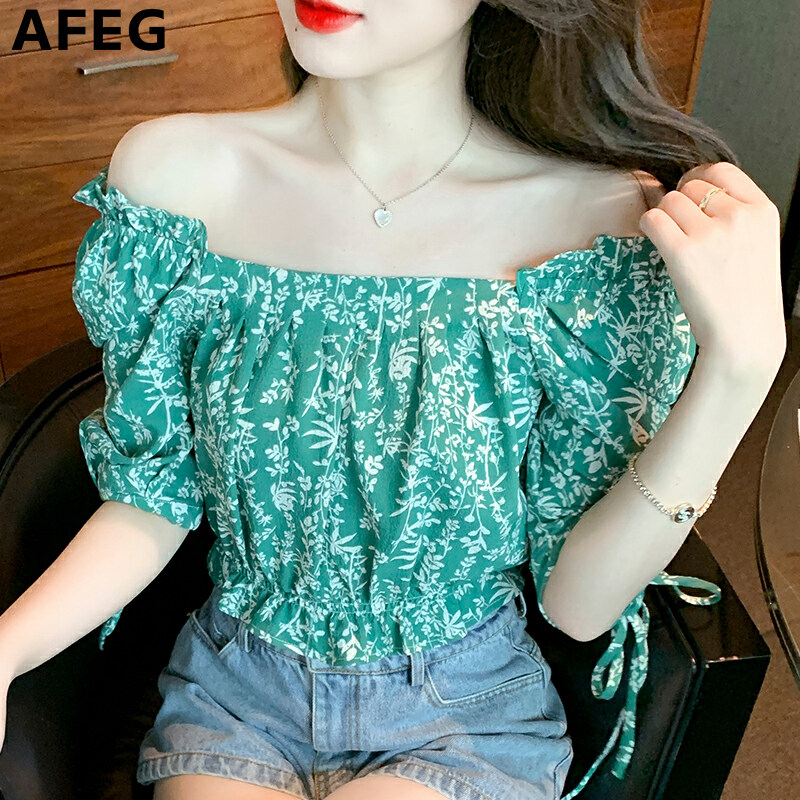 AFEG's new Korean version of the word-neck short, fashionable and thin, all-match floral chiffon puff sleeve blouse for women