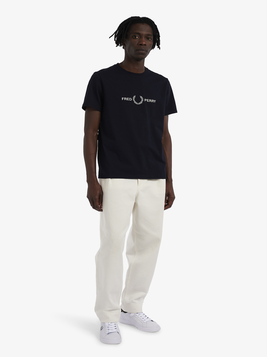 Cotton jersey / Regular fit / Graphic branding embroidery / Printed back branding / Ribbed crew neck .