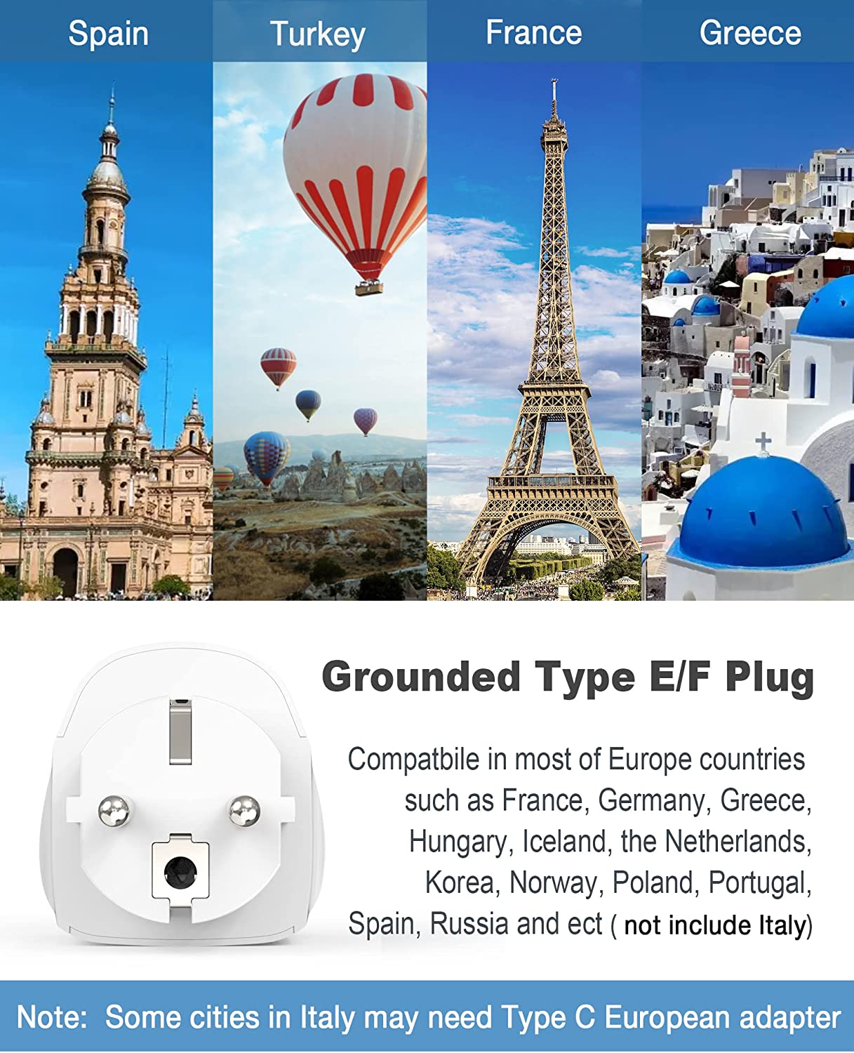 • Works in European Countries: Type E/F Plug is compatible in most of European countries such as Belgium, France, Germany, Greece, Hungary, Iceland, the Netherlands, Norway, Poland, Portugal, Spain, Russia, Korea and more. (Note: some cities in Italy may need other type adapter, please choose the suitable plug before your travel)