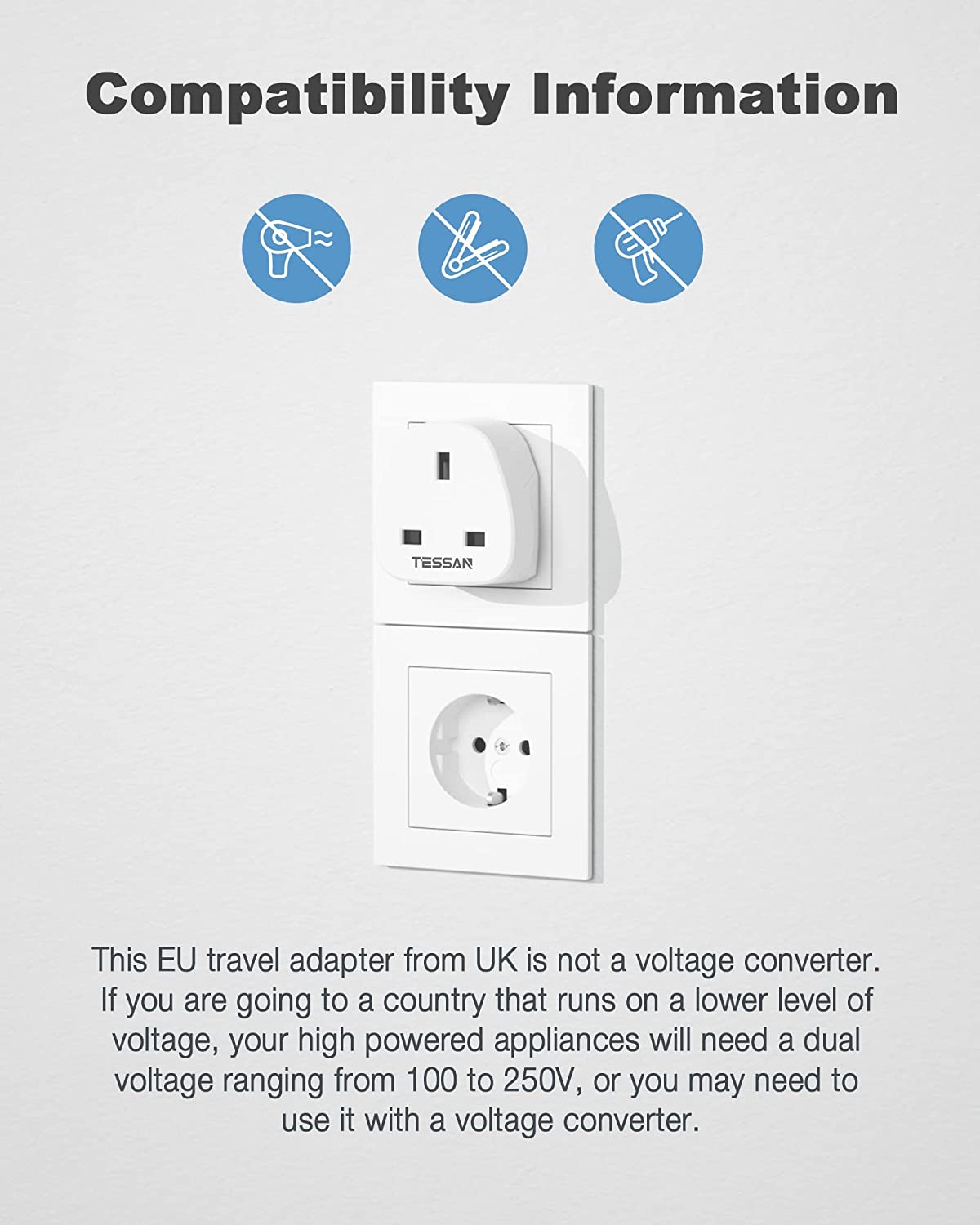 • Instructions for Use: This EU plug adapter is not a voltage converter. If you are going to a country that runs on a lower level of voltage, your high powered appliances will need a dual voltage ranging from 100 to 250 V, or you may need to use it with a voltage converter