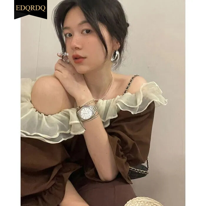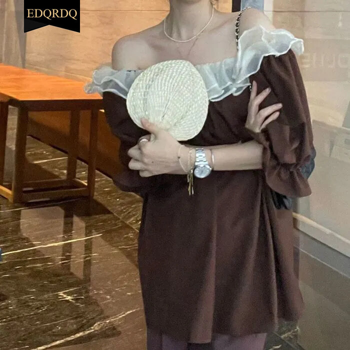 EDQRDQ Women's Off The Shoulder Tops Casual 3/4 Sleeve Blouse Solid Shirts Sexy Ruffle Trim Tunic Tops