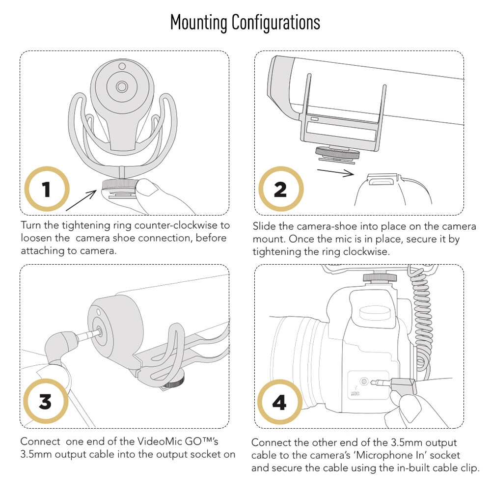 The VideoMic GO has no complicated switches or settings and is powered by your camera's external microphone input, requiring no