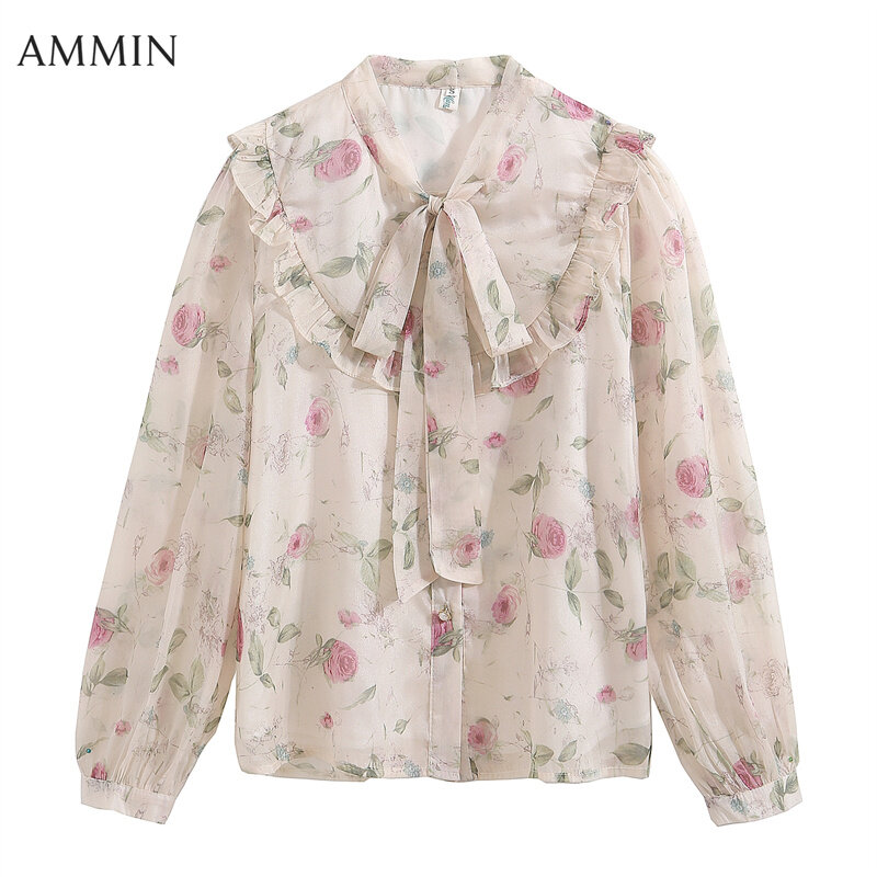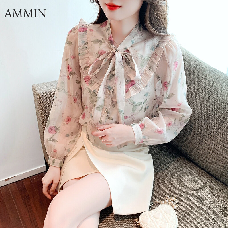 AMMIN Korean-style Women's Long sleeve fashion Gentle wind elegant floral chiffon top 2022 Fall wear new puffed sleeve Ruffle bow Temperament printed chiffon Tops casual Blouse