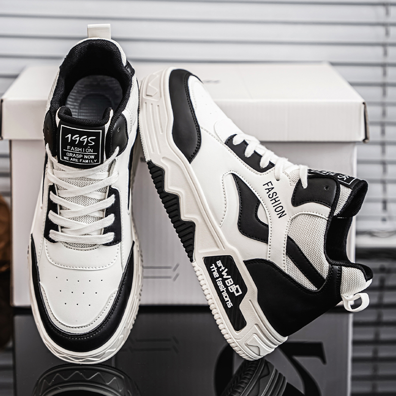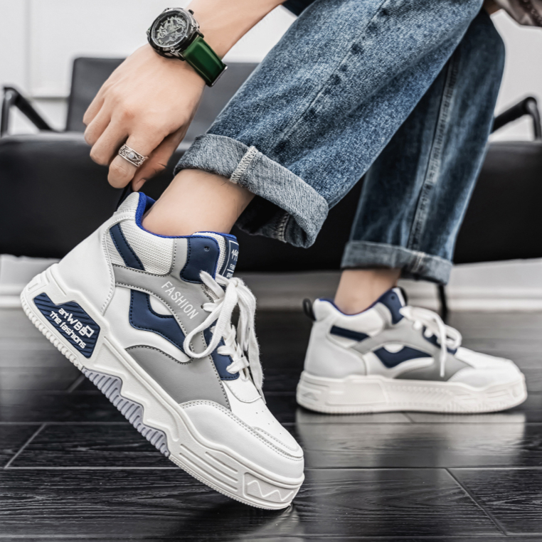 【READY STOCK】Men's high top sports shoes, outdoor casual board shoes, thick soled lightweight sports shoes, round toe lace up running shoes.