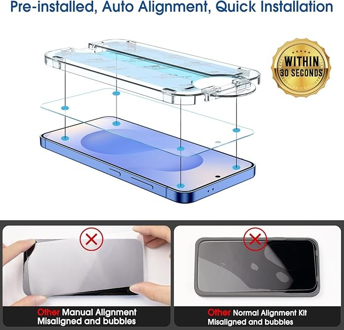 【Auto-Align Installation in 30 Seconds!】Say goodbye to manual misalignment. The Samsung Galaxy S25 6.2-inch screen protector is embedded in a plastic frame for a perfect fit on your phone. Place the frame on your phone, slide it down from the center, and you're done! Perfect installation in 30 seconds! Watch our installation video to see how effortless it is to use our innovative OneTouch auto-aligning screen protector.