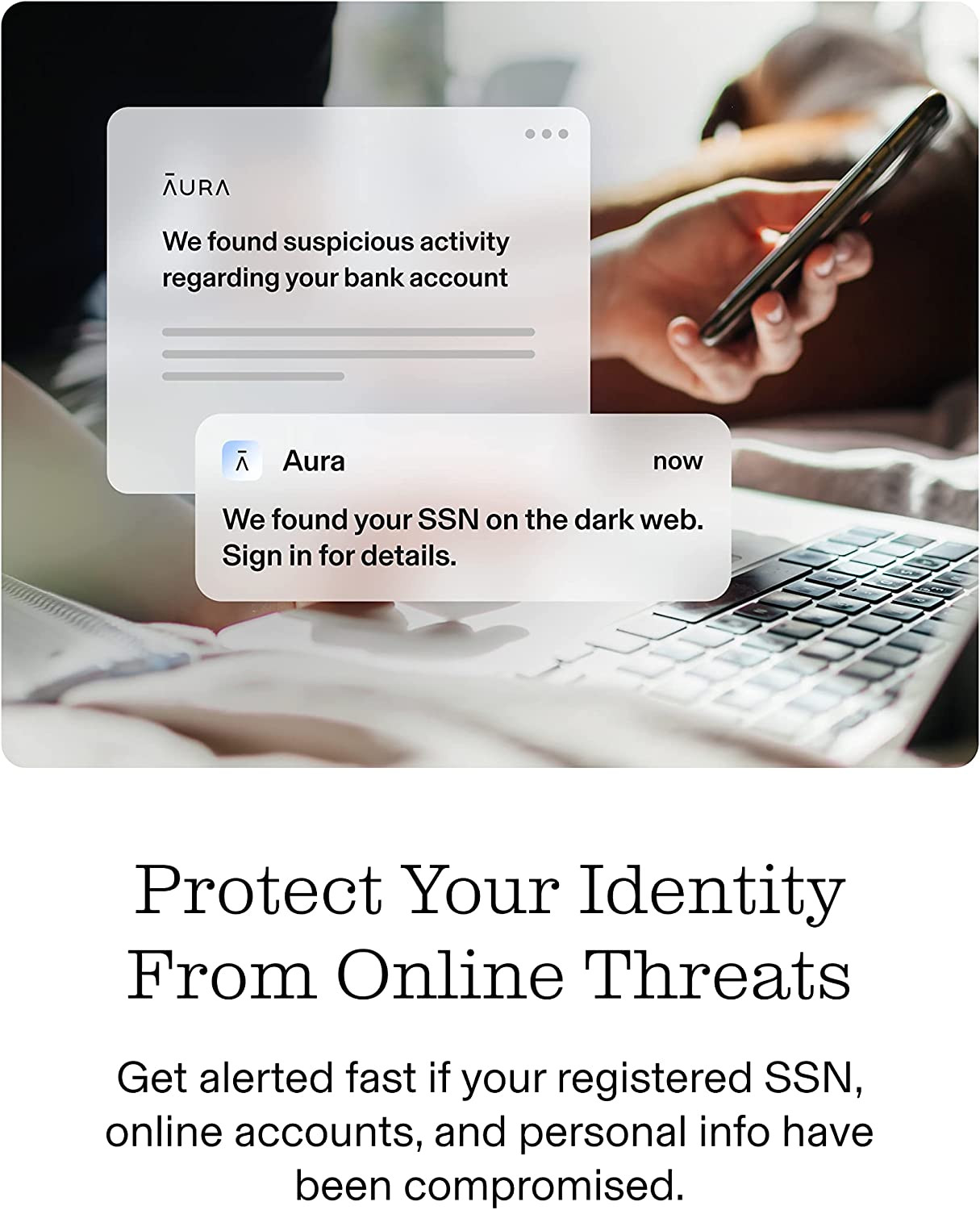 PROTECT YOUR PERSONAL INFO: Aura alerts you if your most sensitive information has been compromised online and is found on the Dark Web.