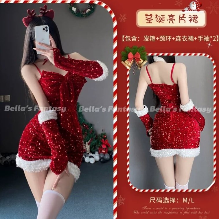 Bella’s Fantasy Women's Christmas Sexy Sequinns Lingerie Set Dress Sleepwear Sexy Nightgown Gift Set Red One Size M-L