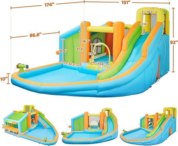 • Well-rounded Private Water Park For Kids: This 8-in-1 water bounce house ensures you and your kids hours of fun in the backyard. It features a large pool area, a slide, a water cannon, a climbing wall with footholds, a bouncer, a basketball hoop, a tunnel, and a cute market stand for pretend play. Suitable for 4 kids aged 3 to 10 (with 99 lb maximum weight for each kid)